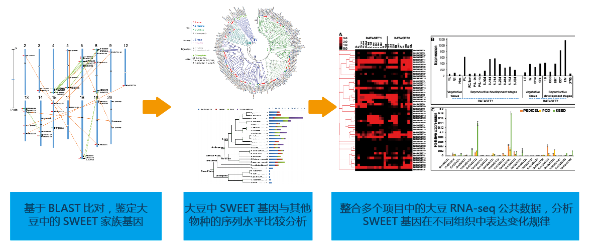 整個(gè)多個(gè)大豆RNA-seq公共數(shù)據(jù),分析SWEET基因家族在大豆生殖組織與營養(yǎng)組織間表達(dá)變化規(guī)律