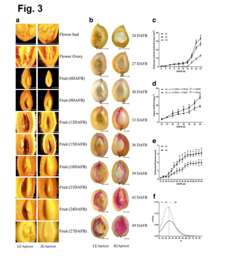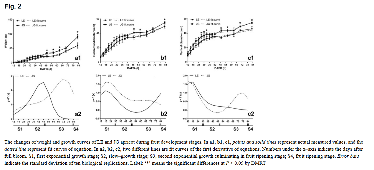 a)如圖2所示,兩種品種杏的果實具有相似的發(fā)育模式,a1、b1、c1是以開花后時間(DAFB)為橫坐標,分別以果實重量、果實長度、果實寬度為縱坐標做圖,兩種杏的果實均呈現(xiàn)出了“雙S曲線”生長模式,圖a2、b2、c2是分別對a1、b1、c1一階導數(shù)作圖,兩種果實同樣也表現(xiàn)出相似的趨勢。 根據(jù)生長曲線,研究者將果實的發(fā)育劃分為4個時期:第一次指數(shù)生長期(before 30DAFB)、緩慢生長期(30-49DAFB)、第二次指數(shù)生長期(49-83DAFB)、成熟期(after 83DAFB)。