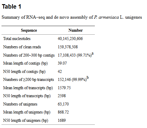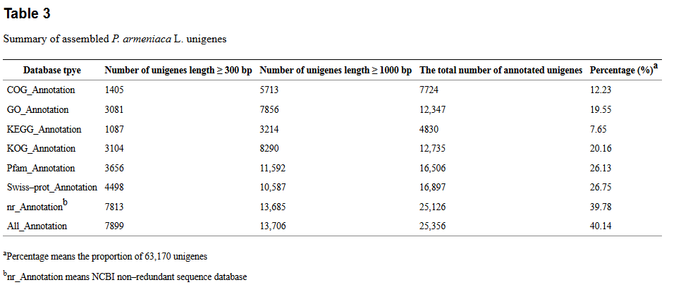 a)基于blast比對,63,170條unigene中有25,356可比對到日本杏(Japanese apricot)與桃(peach)基因組數(shù)據(jù)庫。 b)使用BLASTx(e-value閾值設為10e-5)將上述25,356條unigene比對到NR, Swiss-Port, GO, COG, KOG ,kegg數(shù)據(jù)庫以進行功能注釋,每條unigene均有多條注釋,詳細的注釋結(jié)果統(tǒng)計信息請參見表3. c)GO數(shù)據(jù)庫注釋過程中,16,506條unigene被注釋到,其中, ‘metabolic process’ (8408 genes, 50.93%)是被注釋到最多的GO 條目;KEGG數(shù)據(jù)庫注釋過程中,4830條unigene被注釋到了118個代謝通路。大部分的unigene被注釋到了‘carbohydrate metabolism’ (905 genes), ‘translation’ (596 genes), ‘a(chǎn)mino acid metabolism’ (581 genes), or ‘folding, sorting and degradation’ (471 genes)等代謝通路。
