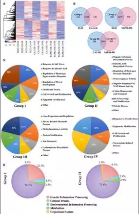c)由于轉(zhuǎn)基因材料中過(guò)表達(dá)基因?yàn)閎ZIP家族轉(zhuǎn)錄因子及其活性激活基因家族,研究者重點(diǎn)關(guān)注了3個(gè)材料中轉(zhuǎn)錄上調(diào)的基因,這些基因被劃分為4類:Group1,XL22相較于CA1-OE特有上調(diào)基因,645個(gè);Group2,XL22相較于SAPK6-OE特有上調(diào)基因,500個(gè)基因特異上調(diào);Group3,CA1-OE相較于SAPK6-OE特有上調(diào)基因,398個(gè);Group4,SAPK6-OE相較于CA1-OE特有上調(diào)基因,869個(gè)。Group I主要分布在“Response to ABA”、“Regulation of Plant-type Hypersensitive response”等GO term;Group II主要分布在“Organic Substance Biosynthetic Process” 、“Salicylic Acid Biosynthetic Process” 、“Regulation of Hydrogen Peroxide Metabolic Process”等GO term;Group3主要分布在“Gene Expression and Regulation”、 “Nitrate Related Metabolic Process” 、 “Carbohydrate Biosynthetic Process” 等GO term;Group4主要分布在 “Cytokinesis and Cell Proliferation”、“Microtubule Related Process”、“Response to Abiotic Stress” 等GOterm(見(jiàn)圖6C)。因此推測(cè),XL22中的兩個(gè)基因可能激活了不同的干旱脅迫應(yīng)答基因。