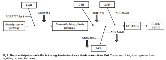 茶樹(Camellia sinensis),富含兒茶素,是風(fēng)靡全球的非酒精飲料之一。兒茶素是茶葉中重要的組成部分,包括脂型兒茶素(如:ECG和EGCG)和非脂型兒茶素(如:EC和EGC)。EGCG是茶葉中含量最豐富的兒茶素并且具有較強(qiáng)的抗癌效果,可以制約癌細(xì)胞的生長,抑制雄激素受體的功能并調(diào)控癌細(xì)胞的生存,血管的生成和移動。基于他們的分子構(gòu)成,兒茶素可以分為簡單兒茶素和脂型兒茶素。在兒茶素的合成過程中有許多酶的參與,如查耳酮合酶(CHS),查爾酮異構(gòu)酶(CHI),黃烷酮醇4-還原酶(DFR),花青素合酶(ANS),花青素還原酶(ANR)和類黃酮3,5羥基化酶(F3’5’H)。MiRNA被鑒定為轉(zhuǎn)錄和轉(zhuǎn)錄后水平基因表達(dá)的重要調(diào)節(jié)因子,并且裂解目標(biāo)mRNA是植物中基因表達(dá)的主要調(diào)控方式。