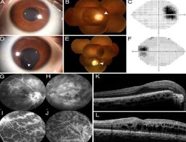 患者是一名14歲男性,攜帶常染色體隱性遺傳病,生于近緣家族,全面眼科檢查顯示其最近左眼視力逐漸喪失,雙眼出現(xiàn)輕微白內(nèi)障癥狀。眼前段裂隙燈檢查顯示右眼正常(圖1A),但左眼6點鐘方向虹膜缺損(圖1D)。眼底檢查右眼視神經(jīng)盤缺損(圖1B),左眼脈絡膜缺損(圖1E)。在視覺范圍上,右眼生理盲區(qū)擴大(圖1C),雙眼視覺對比敏感度低(圖1C,F(xiàn))。其他家庭成員沒有OC或眼部畸形。除OC表型外,眼底熒光血管造影(FFA)和光學相干斷層掃描(OCT)結果提示患雙側視網(wǎng)膜血管炎和繼發(fā)性視網(wǎng)膜劈裂癥(圖1G,H,K和L)。接受2個月激素治療后,雙眼黃斑水腫逐漸消失(圖1I和J)。