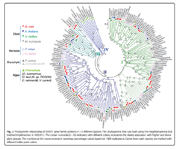 為了了解不同物種中SWEET家族基因的進(jìn)化關(guān)系,研究者對(duì)大豆中的SWEET家族基因與其他13個(gè)物種(包括水稻、擬南芥、玉米在內(nèi))中的SWEET基因構(gòu)建系統(tǒng)進(jìn)化樹。