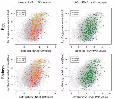 為了探索mRNAs甲基化是否與翻譯有關,作者把mRNA甲基化數據與Smits等人已發(fā)表的轉錄組和蛋白組數據進行了整合。通過BLAST分析,在RNA/蛋白數據中找到了723個m6A修飾mRNAs的信息。GV期或者MII期卵母細胞中高m6A峰的RNA水平(log10 RNA RPKM值)比總RNA高(在卵或者胚胎中),但是蛋白水平(log10 protein amount / fmol)比總蛋白水平低(Figure 2)。與高度甲基化的mRNAs相比,低甲基化RNAs顯示出非常高的表達水平(Figure 3)。這些結果說明在卵母細胞或早期胚胎中,m6A修飾可能與mRNA翻譯有關。