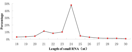 從提取的總RNA中構(gòu)建smallRNA文庫,測序質(zhì)控后得到19,567,691條clean reads,與數(shù)據(jù)庫比對發(fā)現(xiàn)有18.83%的rRNA,1.23%的tRNA,0.01%的small nuclear RNA,0.07%的重復(fù)序列,其中79.85%的序列沒有功能注釋,可以將這些沒有功能注釋的序列用來做下一步的miRNA的預(yù)測和鑒定。根據(jù)smallRNA的測序長度分布圖可以得出,miRNA的長的主要分布在20-25nt之間,豐度最高的是24nt(47.89%)。這個(gè)長度分布和其他栽培茶以及其他植物報(bào)道的結(jié)果非常相似。