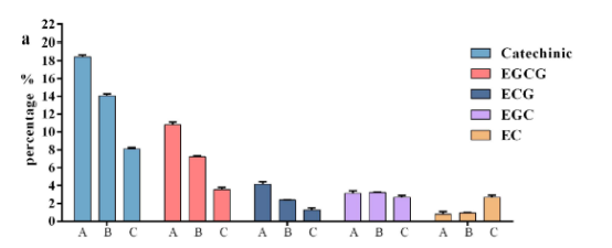 對茶樹1005葉片兒茶素含量的研究發(fā)現(xiàn),兒茶素在不同葉片中的的含量由高到低排序?yàn)椋旱谝蝗~,芽,第二葉,第三葉,成熟葉。第一葉,第三葉和成熟葉的兒茶素含量有顯著差異。
