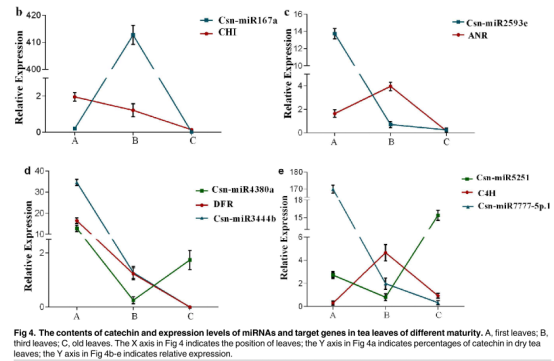 為了更好的了解兒茶素生物合成過程中miRNA與目標(biāo)基因之間的表達(dá)模式以及相互作用,研究人員將不同葉片中兒茶素生物合成相關(guān)基因和miRNA表達(dá)量進(jìn)行分析,并且與兒茶素含量變化的模式相比較。結(jié)果顯示,ANR和C4H有相似的表達(dá)模式,ANR在第三葉中表達(dá)量最高,它與EC,EGC和兒茶素含量沒有明顯的關(guān)系,在綠茶Shuchazao中有過類似的報(bào)道。CHI和DFR的表達(dá)量與兒茶素的含量成正相關(guān)的趨勢,這與之前的報(bào)道一致。經(jīng)分析發(fā)現(xiàn),大多數(shù)的miRNA表達(dá)模式與目標(biāo)基因呈相反的趨勢??傊?,miRNA和目標(biāo)mRNA之間的表達(dá)模式和斷裂位點(diǎn)的負(fù)相關(guān)性是兒茶素生物合成中目標(biāo)miRNA靶向調(diào)控mRNA的有力證據(jù)。