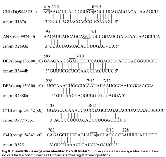 為了深入了解miRNA在調(diào)控兒茶素合成代謝中的功能,研究人員將高通量測序獲得的miRNA跟NCBI數(shù)據(jù)庫以及RNA測序的兒茶素生物合成相關(guān)基因的mRNA進(jìn)行BLAST,預(yù)測可能的miRNA。為了消除假陽性,對預(yù)測的斷裂位點(diǎn)進(jìn)行實(shí)驗(yàn)驗(yàn)證。通過5’-RLM-RACE實(shí)驗(yàn)驗(yàn)證了6個(gè)可能參與兒茶素生物合成功能基因表達(dá)調(diào)控的miRNA。它們分別是csn-miRNA167a、f csn-miR2593e、csn-miR4380a 、csn-miR3444b 、csn-miR5251 和csn-miR7777-5p.1。