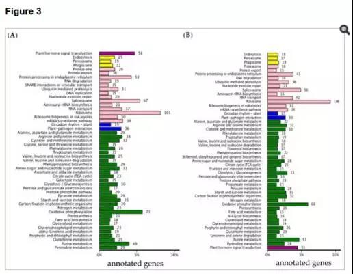 d)對(duì)兩個(gè)時(shí)間點(diǎn)所有差異基因進(jìn)行KEGG通路分析,其中3297個(gè)基因注釋到了KEGG數(shù)據(jù)庫 ,其中大多數(shù)基因注釋到了 ribosome 、oxidative phosphorylation相關(guān)代謝通路。值得注意的是,在兩個(gè)時(shí)間點(diǎn)分別有58、51個(gè)差異基因注釋到了植物激素信號(hào)通路,進(jìn)一步分析發(fā)現(xiàn),這些通路大多為BR或auxin信號(hào)轉(zhuǎn)導(dǎo)通路。該部分結(jié)果如圖3所示。